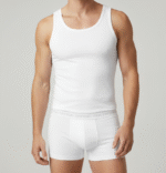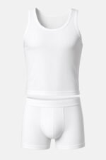 طقم رجالي أبيض، مصنوع من 95% قطن طبيعي و5% ليكرا لراحة مثالية ومرونة أثناء الحركة. تصميم عملي وخفيف يناسب الاستخدام اليومي ويوفر إحساسًا بالانتعاش والثبات طوال اليوم