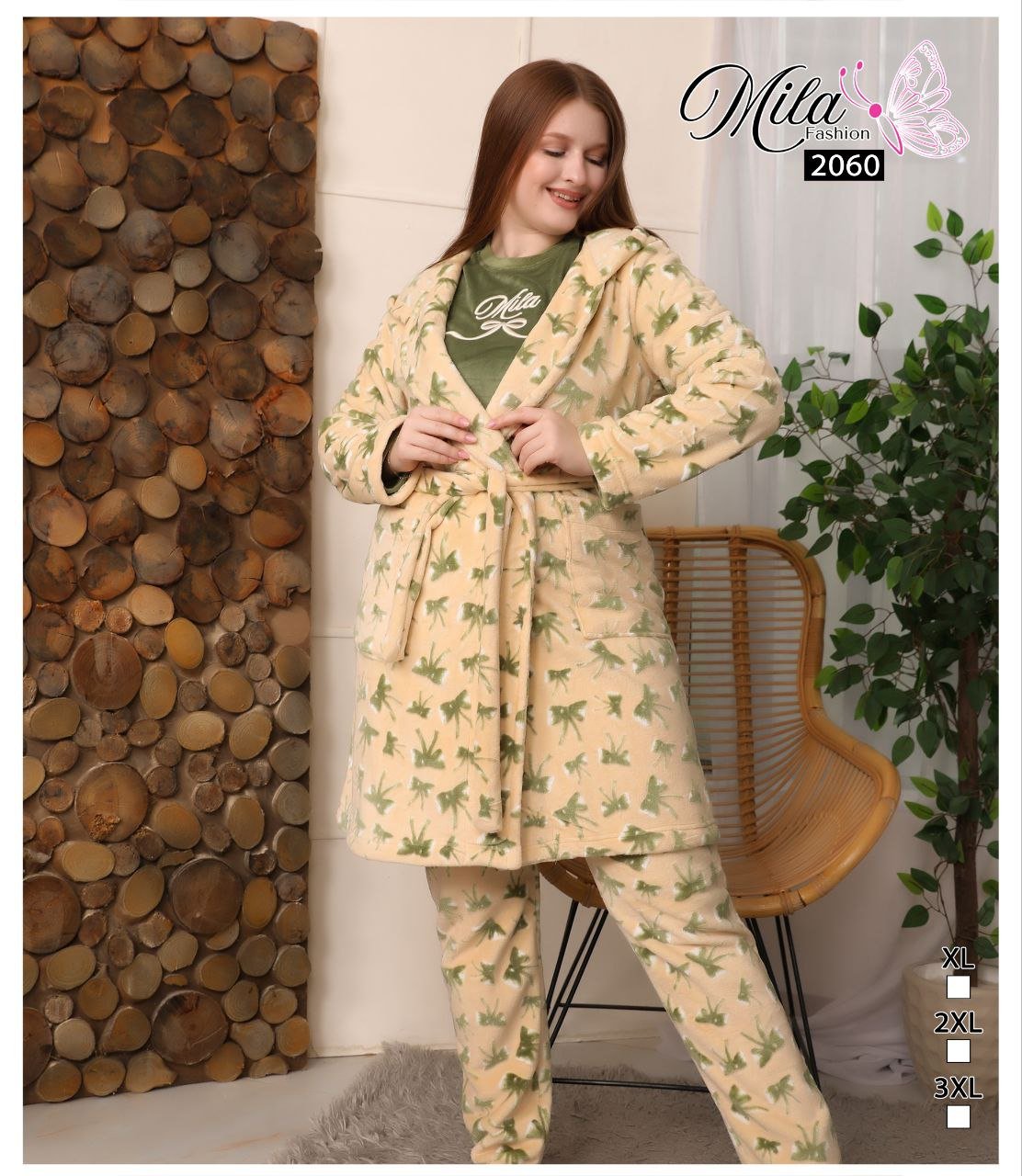 طقم بيجاما نسائي شتوي مع روب – فراشات أنيقة كود 2060