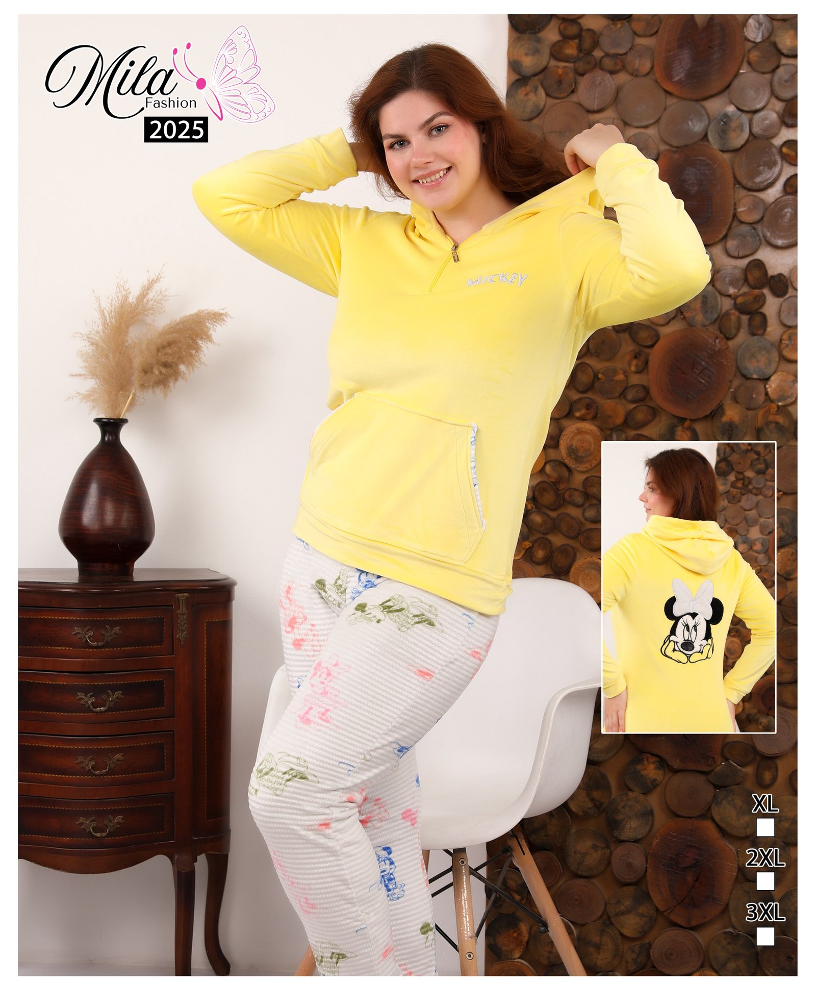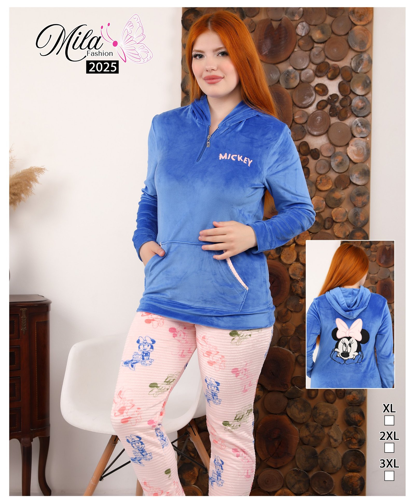 سويت شيرت: لون روز (وردي) سادة من خامة القطيفة الناعمة. يتميز بسوستة قصيرة عند الرقبة (Half-zip) وغطاء رأس (كابيشو)، مع تطريز كلمة “MICKEY” باللون الأبيض على الصدر، وجيب أمامي بحواف بيضاء.