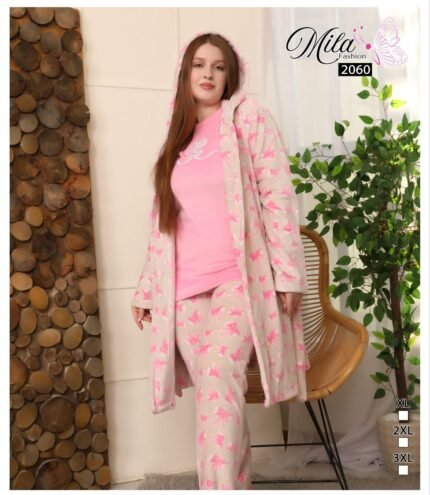 طقم بيجاما نسائي شتوي مع روب – فراشات أنيقة كود 2060